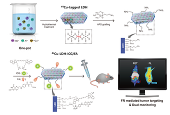연구팀은 생체에 무해한 층상이중수산화물(LDH) 나노 물질을 기반으로, PET 진단용 방사성동위원소인 구리-64(64Cu)와 NIRF 촬영용 형광 물질인 인도시아닌 그린(ICG), 그리고 암세포를 찾아가는 표적 물질인 엽산(FA)을 결합시켜 나노플레이트(64Cu-LDH-ICG/FA)를 개발하고 그 효능을 평가했다.