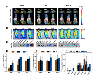 [그림2] 암세포 종류(A549, KB, HeLa)에 따른 이중영상 나노플레이트(64Cu-LDH-ICG/FA)의 체내 분포
