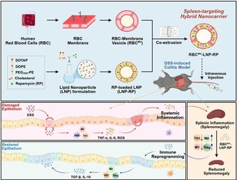 △인간 적혈구 세포막 기반 비장 표적형 생체모사 나노전달체의 개념도 및 염증성 장질환 치료 메커니즘