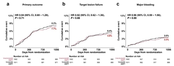 연구 결과, 단기투약군은 장기투약군 대비 장기적 효과와 안전성에서 차이가 없었다. 1차 평가 지표로서 심장관련 사망, 목표혈관 심근경색, 목표병변 혈관재개통술, 스텐트 혈전증, 주요 출혈을 포함한 ‘순 임상사건 발생률’은 단기투약군과 장기투약군이 각각 7.7%, 8.2%로 유사했다. 또한, 2차 평가 지표인 목표병변실패 발생률(치료 효과), 주요 출혈 발생률(안전성)도 유의미한 차이가 없었다.