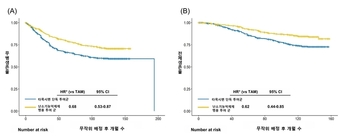 ▲무병 생존율(DFS)(A) 및 전체 생존율(OS)(B)에 대한 Kaplan–Meier 곡선 그래프.