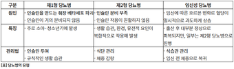 임신성 당뇨병은 임신 중 호르몬 변화로 혈당이 일시적으로 상승하는 경우로, 출산 후 대부분 정상으로 회복되지만, 일부는 제2형 당뇨병으로 이어질 수 있어 추적 관찰이 필요하다. 국내 당뇨병 환자의 대부분은 제2형 당뇨병이며, 제1형 당뇨병은 전체의 2% 미만이다.