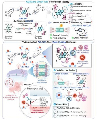 △ [첨부] 설명 : 빛에 의해 활성화된 NDI-COE가 암세포막–물 계면에서 물 산화를 촉진해 활성산소종을 생성하고,