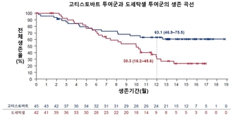 12개월 시점에서는 고티스토바트군이 도세탁셀군보다 두배 높은 생존율을 보여준다