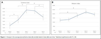 피부 색소 변화를 나타내는 멜라닌 지수(Melanin Index) 역시 치료 전 123.79 AU에서 치료 6주 시점 221.53 AU로 약 79% 증가했다가 이후 192.53 AU 수준으로 감소해 색소 변화가 점차 완화되는 경향을 보였다.