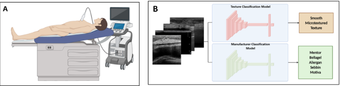 그림】 . 본 연구에서 개발한 인공지능(AI)을 활용한 유방 보형물 자동 식별 및 분류 과정. (A) 초음파 영상 입력: 다양한 의료 현장에서 촬영된 유방 초음파 영상을 수집하여 분석 시스템에 입력함. (B) 보형물 영역 자동 탐지 및 맞춤형 분류: 인공지능 모델이 초음파 영상 내에서 분석이 필요한 보형물 영역을 자동 검출 및 추출하여 다른 초음파 장비 제조사 간의 호환성과 분석의 일관성을 확보한 후, 추출된 이미지를 기반으로 두 개의 개별적인 딥러닝 모델이 작동하여 제조사(5종)와 표면 형태(3종)를 최종 예측함.