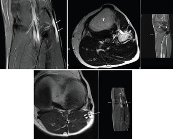 허리에서 시작하여 엉덩이 뒤쪽을 지나 다리 뒤편 허벅지, 종아리를 따라 발까지 내려가는 우리 몸에서 가장 크고 굵은 신경 다발인 좌골신경에서 발생한 희귀 난치성 양성종양 '신경내 결절종'(화살표 부분) MRI 영상 검사 사진