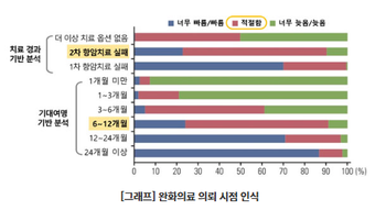 추가적으로 완화의료 의뢰 시점 인식도 국제적 권고 기준(진행암 진단 초기 또는 기대여명 12개월 이내)보다 늦었다. 치료 경과 분석 시 ‘2차 항암치료 실패’가 가장 적절한 의뢰 시점이라고 꼽혔다. 그러나 응답자의 70%가 ‘1차 항암치료 실패’ 시점이 이르다고 평가해, 완화의료가 여전히 말기 치료의 일환으로 인식됨을 보여줬다. 기대여명 분석에서도 ‘6~12개월’이 가장 적절한 의뢰 시점으로 꼽혔지만, 절반 이상의 응답자는 ‘3~6개월’도 적절하다고 평가했다.