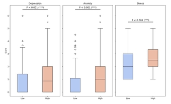 ▲그림 2. 생활불규칙성이 높은 그룹(빨강)과 낮은그룹(파랑)의 평균 정신건강상태 비교