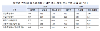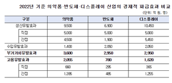 연구 보고서에 따르면 한국은행이 제시한 2020년과 2022년 산업연관표를 이용, 반도체·디스플레이·의약품 등 3개 국가첨단전략산업간의 연관관계를 수량적으로 분석한 결과 부가가치 및 고용유발효과에선 의약품산업이 가장 높은 것으로 분석됐다. 한국은행 산업연관표에서 계수 확인이 불가능한 이차전지산업을 제외하고 3개 국가첨단전략산업간 비교를 한 결과 생산유발효과는 디스플레이-의약품-반도체순으로 파악됐다.