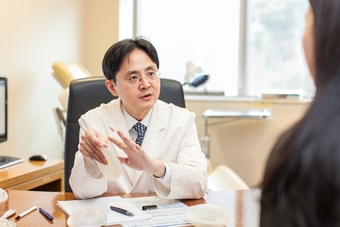 사진설명. 전병준 삼성서울병원 성형외과 교수가 유방암 수술 후 재건성형 관련하여 환자와 상담하고 있다.>