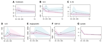 <그래프. 옥사이리스 군(빨간색), 표준 필터 사용 군(파란색)의 7일 이내 염증 지표 변화. 인터루킨(IL)-6, 염증 유발 성장분화인자(GDF)-15 수치가 감소하는 경향을 보였다.>