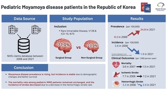 모야모야병은 뇌로 혈액을 공급하는 혈관이 원인 없이 점차 좁아지는 만성 진행성 뇌혈관질환이다. 10세 전후 소아와 40세 전후 성인에서 주로 발병하며, 부작용으로는 뇌혈관이 막히거나 파열되는 허혈성·출혈성 뇌졸중이 있다. 그중 소아 환자는 성인보다 허혈성 뇌졸중이 빈번하고, 장기 예후가 대체로 양호하지만, 3세 미만 어린 연령에서는 진행이 빨라 주의가 필요하다. 그러나 국내 소아 모야모야병 인구를 분석한 장기간 역학 자료는 제한적이었고, 이들의 예후를 분석한 결과도 드물었다.
