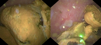 ◆거대 담관결석(좌)과 홀뮴레이저로 효과적으로 분쇄된 모습(우)