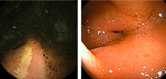 ▲[사진] 캡슐내시경에서 관찰된 종주성 궤양(왼쪽)과