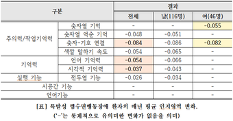 또한 기억력 검사에서도 언어 기억력(매년 z-점수 0.054 감소)과 시각적 기억력(매년 0.037 감소)이 꾸준히 저하됐다. 이러한 변화는 단기간에는 체감하기 어렵겠지만 장기간 누적되면 임상적 의미 있는 수준까지 도달할 수 있다고 연구팀은 설명했다.