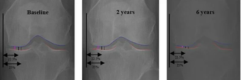 ▲초기, 2년, 6년 시점별 관절 간격 측정 비교. AI가 찾은 oJSW(보라색)가
