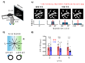 연구진은 생쥐 뇌 신경세포의 활성 변화를 형광 신호를 이용해 추적하는 칼슘 이미징 기법으로 수백에서 수천 개의 반응을 동시에 확인했다. 더하여, 시각 정보를 가장 먼저 처리하는 일차시각피질(V1)과 판단 및 행동에 관여하는 후두정피질(PPC)의 신경세포 집단 활성을 비교해, 뇌 영역에 따른 움직임 정보가 어떻게 표현되는지 살펴봤다.