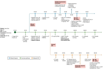 의료 AI의 개입 시점에 따라 중증 환자의 예후가 세 가지 경로(초록색: 안정화, 파란색 및 주황색: 상태 악화)로 갈라지는 파급 효과 시뮬레이션