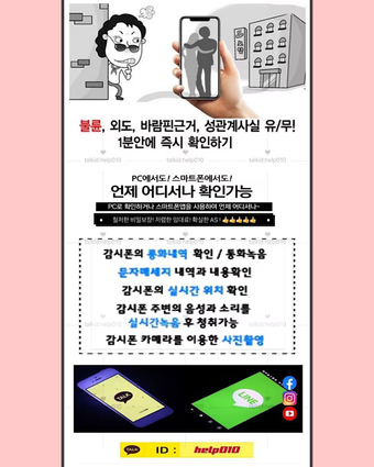 주의할점:(다른업체랑 비교해보시면 아실테지만 저희는 고개님들 요구하시면 최소한 실제상대폰 감시앱(복제폰)툴은 확인시켜드리고 꼭 구매하실분들한텐 실제작동되는 샘플영상 보여드리며 이 기본적인것도 없는곳은 100%허위업체입니다)