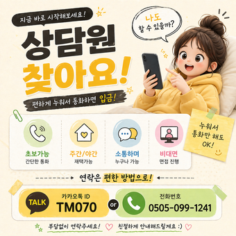 어려운 업무가 아니라서 대화 매너만 있다면 5분 만에 바로 시작하실 수 있습니다.