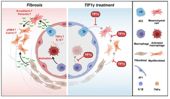자료1] 폐 섬유증 악화 및 차단 기전. TIF1γ 유전자는 대식세포 흥분 단계, 간엽세포 형질전환 단계, 섬유모세포 활성화 단계에서 모두 차단효과를 발휘함.