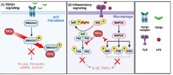 [자료2] TIF1γ 유전자의 섬유화 차단 기전. (1)TIF1γ는 AT2 세포와 섬유모세포에서 TGF-β 신호를 차단하고, (2)대식세포에서 염증 신호 경로(NF-kB, MAPK)를 복합적으로 차단하여 강력한 효과를 보임