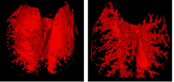 자료3] 미세CT 기반 동물 폐조직 분석. TIF1γ 적용 후 섬유화 영역(빨간색)이 감소함
