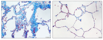 [자료4] 체외배양 인간 폐 조직 분석. TIF1γ 적용 후 섬유화로 인한 콜라겐 침착(파란색)이 감소되고 폐포의 구조가