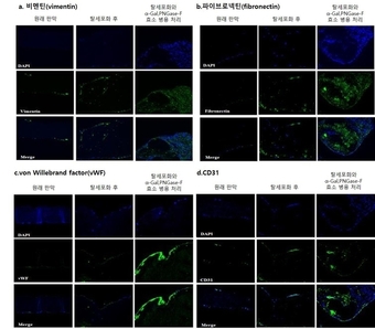 α-갈락토시다아제(α-Gal)와 PNGase-F로 처리한 이종조직판막에 사람 줄기세포와 제대정맥 내피세포를 공배양했을 때, Vimentin(a), Fibronectin(b), vWF(c), CD31(d) 발현이 모두 증가해 재세포화가 촉진된 모습(초록색 발현량 증가).