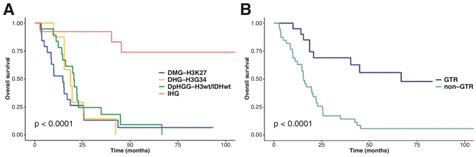 ▲소아 고등급 교종 환자 생존 분석 결과: (A) 영아형 대뇌반구 교종(IHG)은 다른 아형에 비해 예후가 양호했으며, 2년 생존율 92.3%, 5년 생존율 73.8%를 보였다. (B) 수술 전절제(GTR) 환자군이 비전절제(non-GTR) 환자군보다 생존율이 유의하게 높았다(p<0.0001).