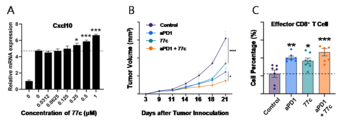 또한 77c를 투여하자 암세포를 직접 공격하는 CD8+ T세포 등 면역세포가 종양 조직 내부로 더 많이 침투했고, 암을 기억해 다시 공격할 수 있는 CD8+ T세포*와 NK 세포 등 항암 면역 반응을 담당하는 세포들의 활성이 전신 면역계에서 전반적으로 높아지는 것으로 나타났다. 즉, 77c가 면역세포의 ‘공격력’을 전반적으로 끌어올려 암세포를 더 효과적으로 제거하도록 만든 것이다.