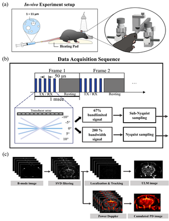 [그림 1] ULM Lite 개념도: in vivo 실험 구성, 데이터 취득 시퀀스, 그리고 재구성 파이프라인 (a–c)