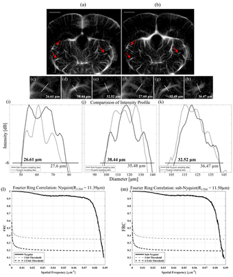(그림설명) 마우스 뇌 초해상 혈관 지도에서 ULM Lite가 기존 ULM과 유사한 구조·대비를 재현하며, 선강도 프로파일로 본 혈관 직경도 근사함. FRC 분석 결과 해상도는 Nyquist 11.39 µm, Sub-Nyquist 11.50 µm로 사실상 동등 수준임을 시사하는 결과.