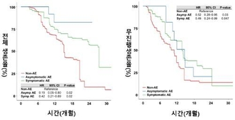 ▲무이상반응군(Non-AE), 무증상 영상군(Asymp AE), 증상군(Symp AE)에서 전체 생존율(OS, 왼쪽)과 무진행생존율(PFS, 오른쪽)을 Kaplan–Meier 곡선과 시간 종속 Cox 회귀모형으로 비교한 결과. 무증상 영상군(파란색)은 사망 위험과 질병 진행 위험이 가장 낮아 통계적으로 유의하게 우수한 예후를 보였다.