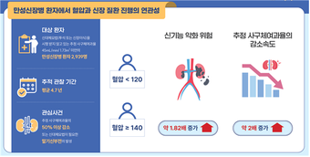 연구 결과, 수축기 혈압이 140mmHg 이상인 환자는 120mmHg 미만인 환자 대비 신장 기능 악화 위험이 약 1.82배로 높았고, 약 5년간 추적 관찰한 결과 신장기능 감소 속도도 약 2배 빨랐다.