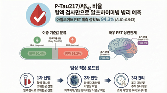 알츠하이머병은 뇌 속에 아밀로이드 베타 단백질이 쌓이고 타우 단백질이 엉키면서 뇌세포가 손상되어 발생한다. 이번 연구에서 혈액 바이오마커(p-tau217/Aβ42) 비율은 아밀로이드 병리뿐만 아니라 뇌 타우 PET 영상에서 확인되는 타우 단백질 침착 정도, 그리고 MRI로 측정한 알츠하이머성 뇌 위축 소견과도 강력한 상관관계를 보였다.