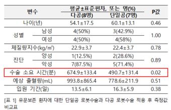 연구 결과, 단일공 수술을 받은 실험군 수술 시간이 다공 수술을 받은 대조군에 비해 유의미하게 짧았다는 결과값(490.7±131.4분 vs. 674.9±133.4분, p=0.02)을 얻어냈다. 하지만, 환자 생리적 안정성을 평가하는 예상 출혈량(EBL) (778.6±211.9㎖ vs. 993.8±865.4㎖, p=0.51) 과 수술 후 회복 속도를 짐작할 수 있는 입원 기간(16.3±5.9일 vs. 13.5±6.1일, p=0.38)에는 통계적으로 유의한 차이를 발견할 수 없었다.