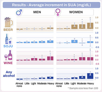 삼성서울병원 건강의학본부 강미라 교수, 의학통계센터 김경아 교수·홍성준 박사, 강북삼성병원 류마티스내과 안중경 교수 공동 연구팀은 같은 알코올 섭취량이라도 성별, 술의 종류, 음주 방식에 따라 혈청 요산(serum uric acid) 수치에 미치는 영향이 달라진다고 ‘대한의학회지(Journal of Korean Medical Science)’ 최근호에 발표했다.