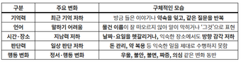 초기에는 최근에 있었던 일이나 대화 내용을 잘 기억하지 못하고 같은 질문을 반복하는 모습이 흔하다. 방금 들은 이야기를 잊거나 물건 이름이 잘 떠오르지 않아 말이 막히는 경우도 있다. 병이 진행되면 날짜와 요일을 헷갈리거나, 익숙한 장소에서도 방향 감각이 흐려질 수 있다. 판단력과 계획 능력이 떨어지면서 돈 관리나 약 복용 같은 일상적인 활동이 어려워지기도 한다. 기억력 저하 외에도 우울, 불안, 불면, 짜증, 의심 같은 행동 변화가 동반되는 경우가 적지 않다. 이러한 변화가 수개월 이상 지속되고 일상생활에 영향을 주기 시작했다면 단순한 노화로만 보기는 어렵다.
