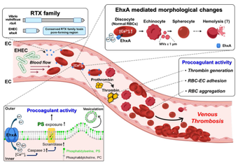 충남대학교 약학대학 정한영 교수 연구팀이 한양대 배옥남 교수팀과 공동으로 장출혈성 대장균(EHEC) 감염 시 발생하는 치명적인 혈전 합병증의 원인이 기존에 알려진 ‘시가독소’가 아닌 ‘RTX 계열 독소(EhxA)’에 의한 적혈구의 변형에 있음을 세계 최초로 규명했다.