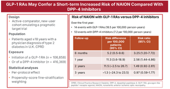 그 결과, 치료 시작 후 1년 이내 NAION 발생 위험은 GLP-1 치료제 사용군에서 비교군 대비 약 2.6배 높았다(위험비 2.56, 95% 신뢰구간 1.44-4.86).