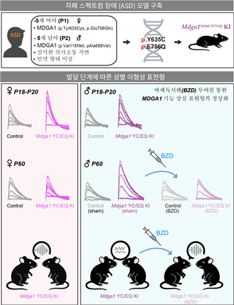 DGIST(총장 이건우) 뇌과학과 시냅스 다양성 및 특이성 조절 연구단(센터장 고재원 교수)은 신경세포 간 연결 및 특성을 조절하는 핵심인자인 MDGA1의 유전자 변이가 자폐 스펙트럼 장애(autism spectrum disorder)를 일으키는 새로운 원인임을 규명하고, 이를 치료할 수 있는 약물 가능성을 제시했다고 1일 밝혔다. 특히 이번 연구는 자폐증이 왜 여성보다 남성에게 더 빈번하게 발생하는지에 대한 생물학적 단서를 제공해 큰 의미가 있다.