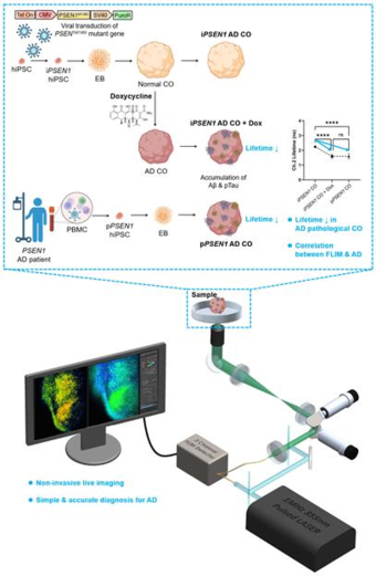 △ hiPSC를 기반으로 구축한 알츠하이머병 뇌 오가노이드 모델과 FLIM 분석 플랫폼의 전체 흐름을 시각화한 그림