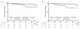 카플란-마이어 분석 생존곡선(Kaplan–Meier curves). 조직학적 등급에 따라 1등급과 2등급은 푸른색으로, 3등급은 붉은색으로 표현함. (A) 그래프는 전체 연구 대상 1,944명을 연구한 결과로, 조직학적 등급이 높으면 무재발 생존 기간이 상대적으로 줄어듦. (B) 그래프는 50세 이하 젊은 환자 1146명을 연구한 결과로, 이 역시 조직학적 등급이 높으면 무재발 생존 기간이 상대적으로 줄어들었음.